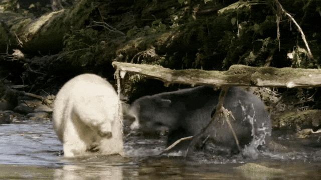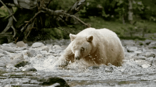 这里也是地球上最珍稀的熊类~白色灵熊的栖息地!在小溪边就可以看到熊捕食三文鱼的奇景。